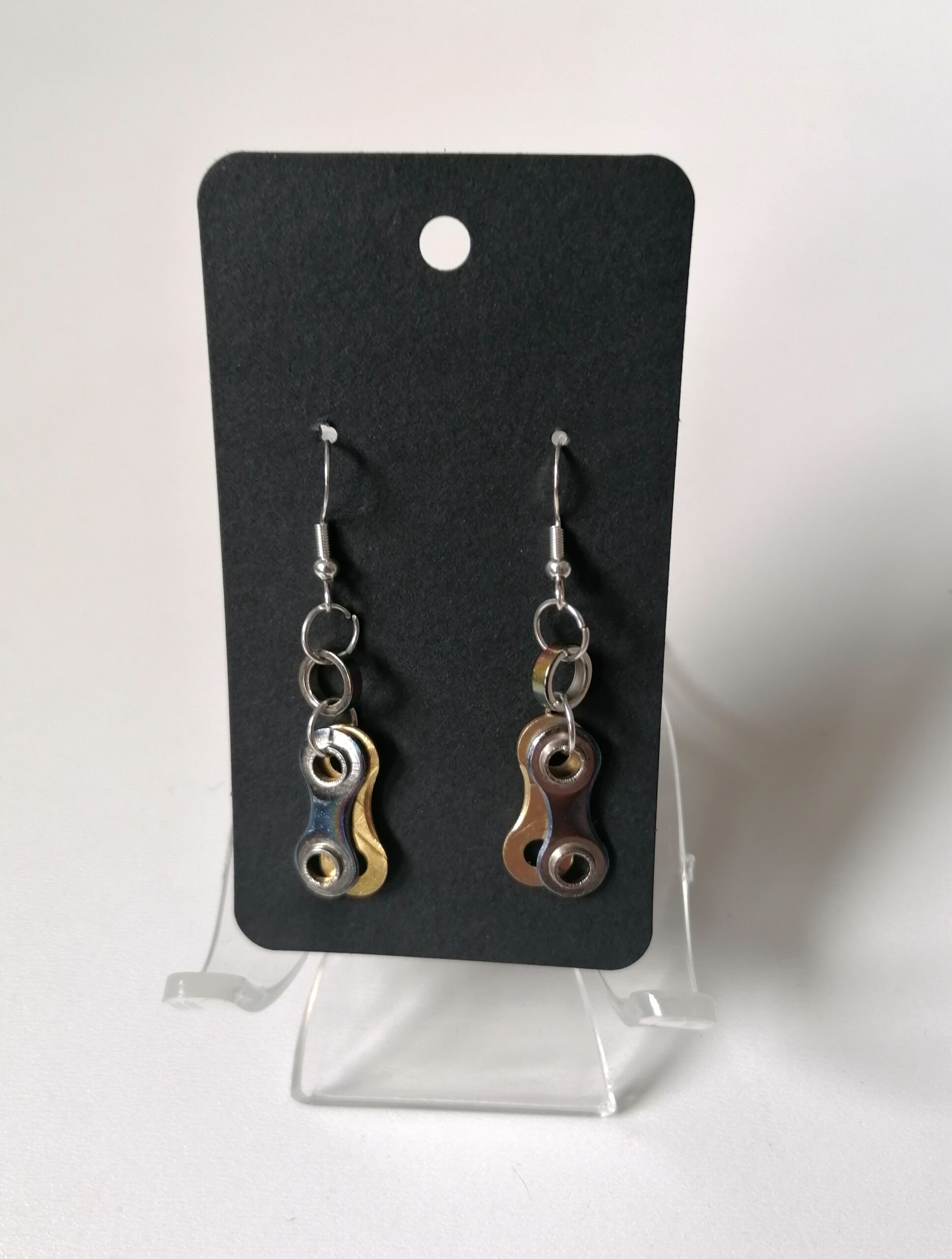 Handmade bike chain earringsĀ by Bristol based artist Diego Godoy. The bike chain parts are stainless steel and come in gold and iridescent colours. The hooks are sterling silver.