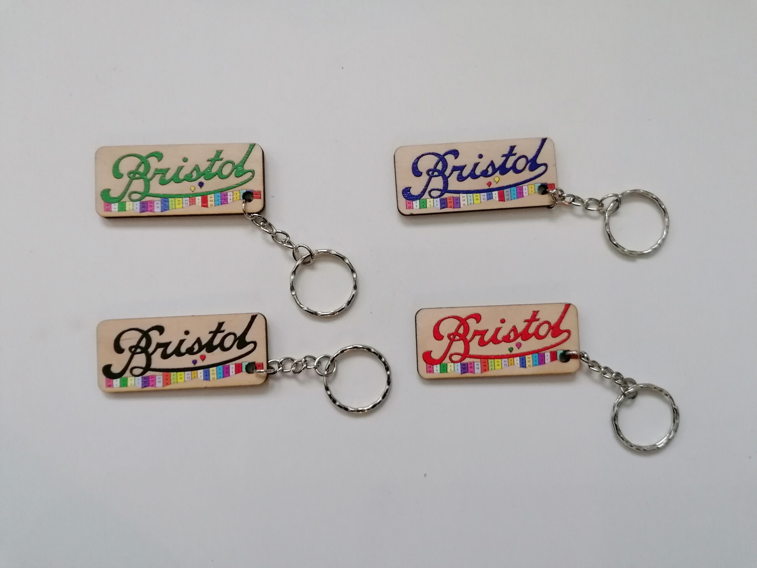 Bristol (UK) logo keyring – laser cut and etched from 3mm FSC plywood, printed in a choice of colours.