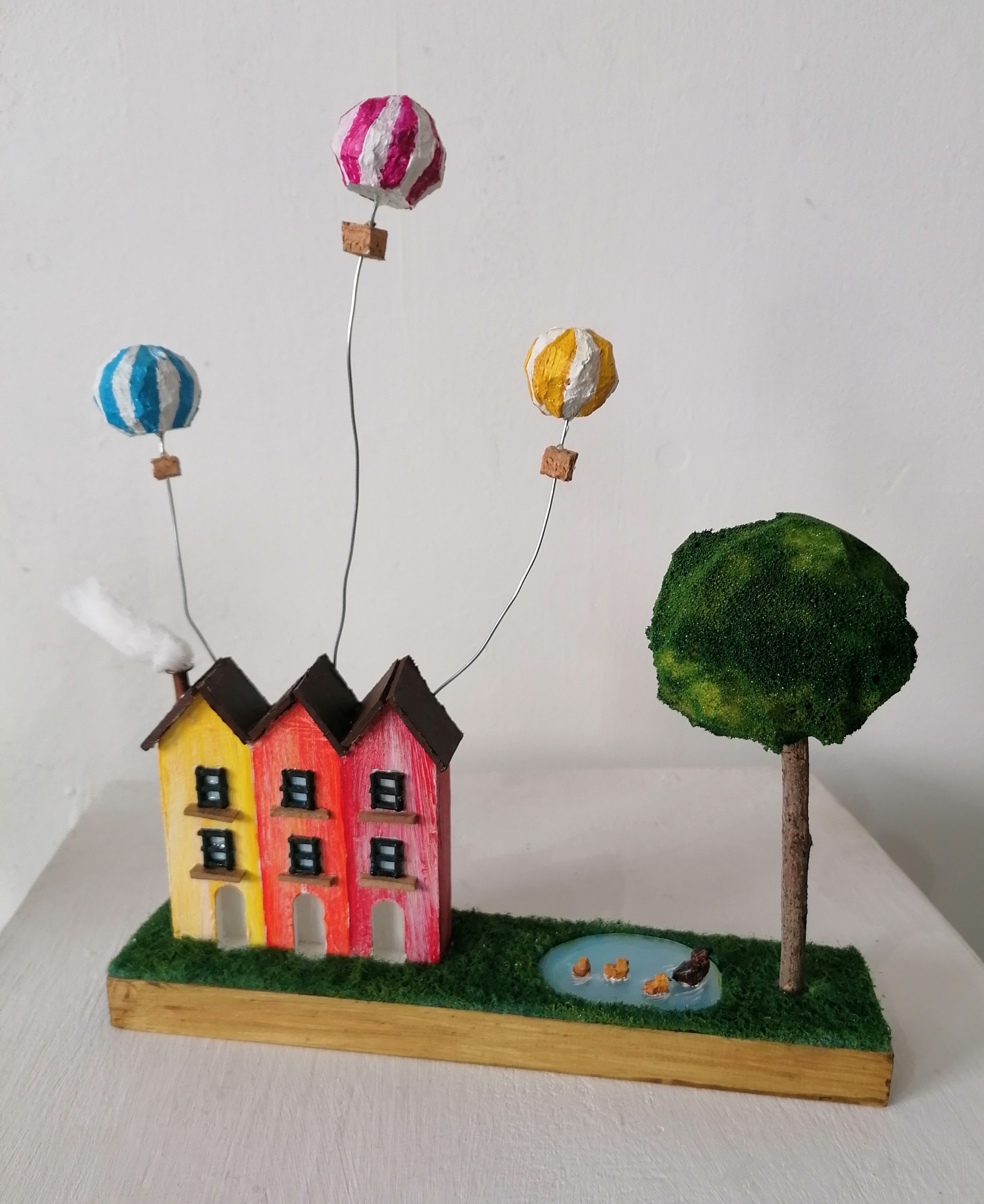 Handmade by Diego Godoy. This unique diorama has colourful houses, balloons, a tree and duck pond.
