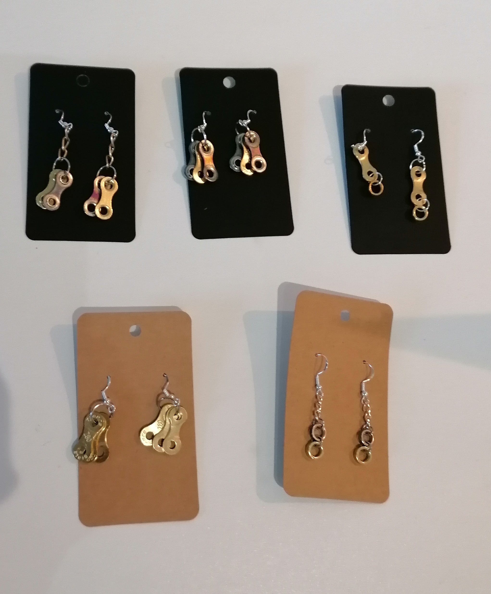 Handmade bike chain earringsĀ by Bristol based artist Diego Godoy. The bike chain parts are stainless steel and come in various colours and styles. The hooks are sterling silver.