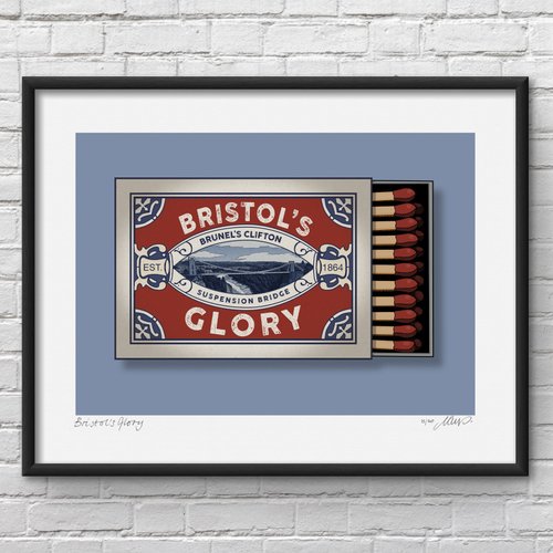 For this artwork I was inspired by the old style Bryant & May matchbox and the Clifton Suspension Bridge. I drew the central illustration and matches with fine liner pens, scanned the images into my computer and coloured them in Photoshop. I also designed the rest of the matchbox in Photoshop making this a mixed media artwork.