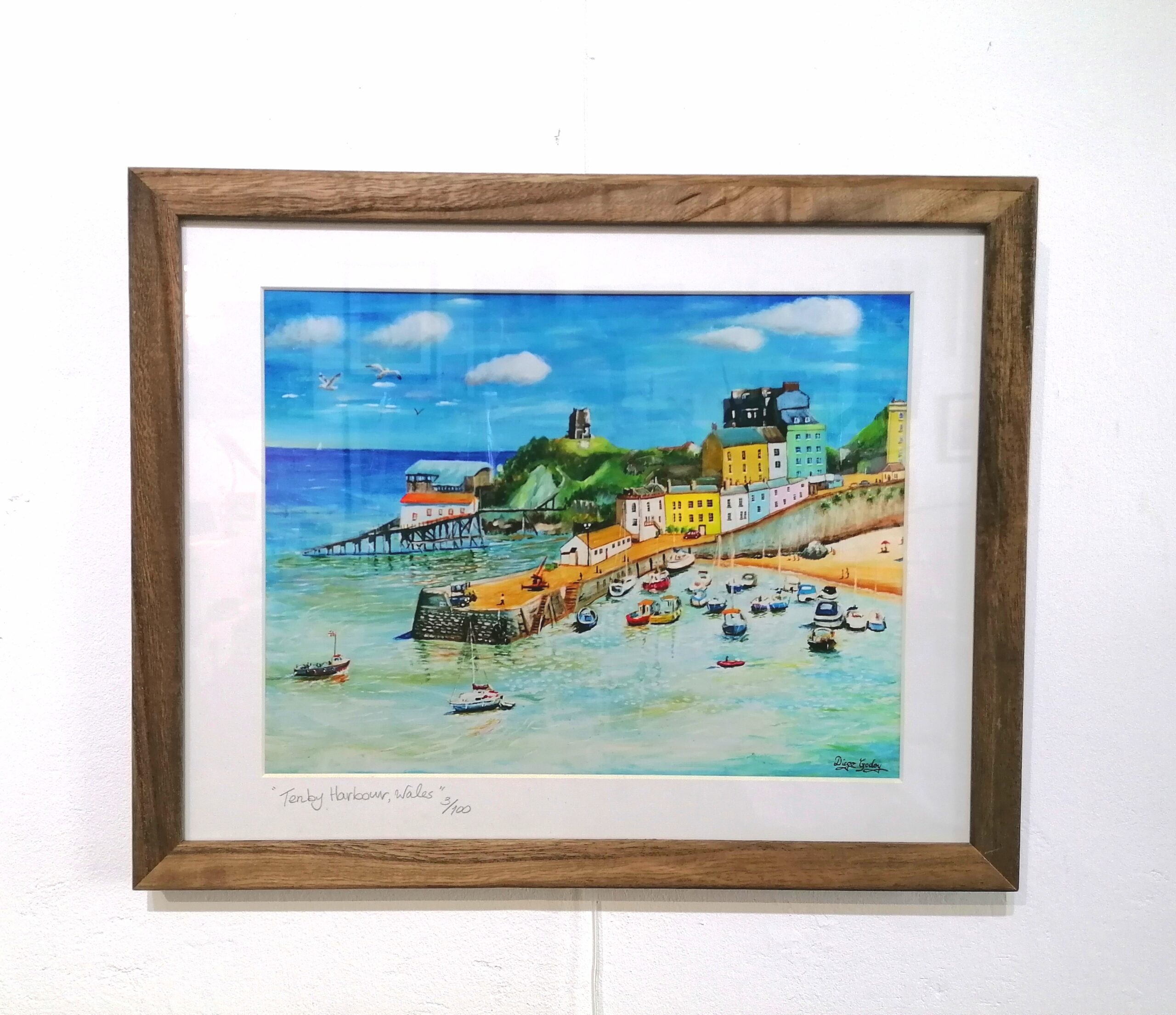 Limited edition mounted and framed print of an original acrylic painting by Bristol based artist Diego Godoy. The artwork features a picturesque scene of Tenby Harbour, the lifeboat houses, colourful houses and Tenby Castle.