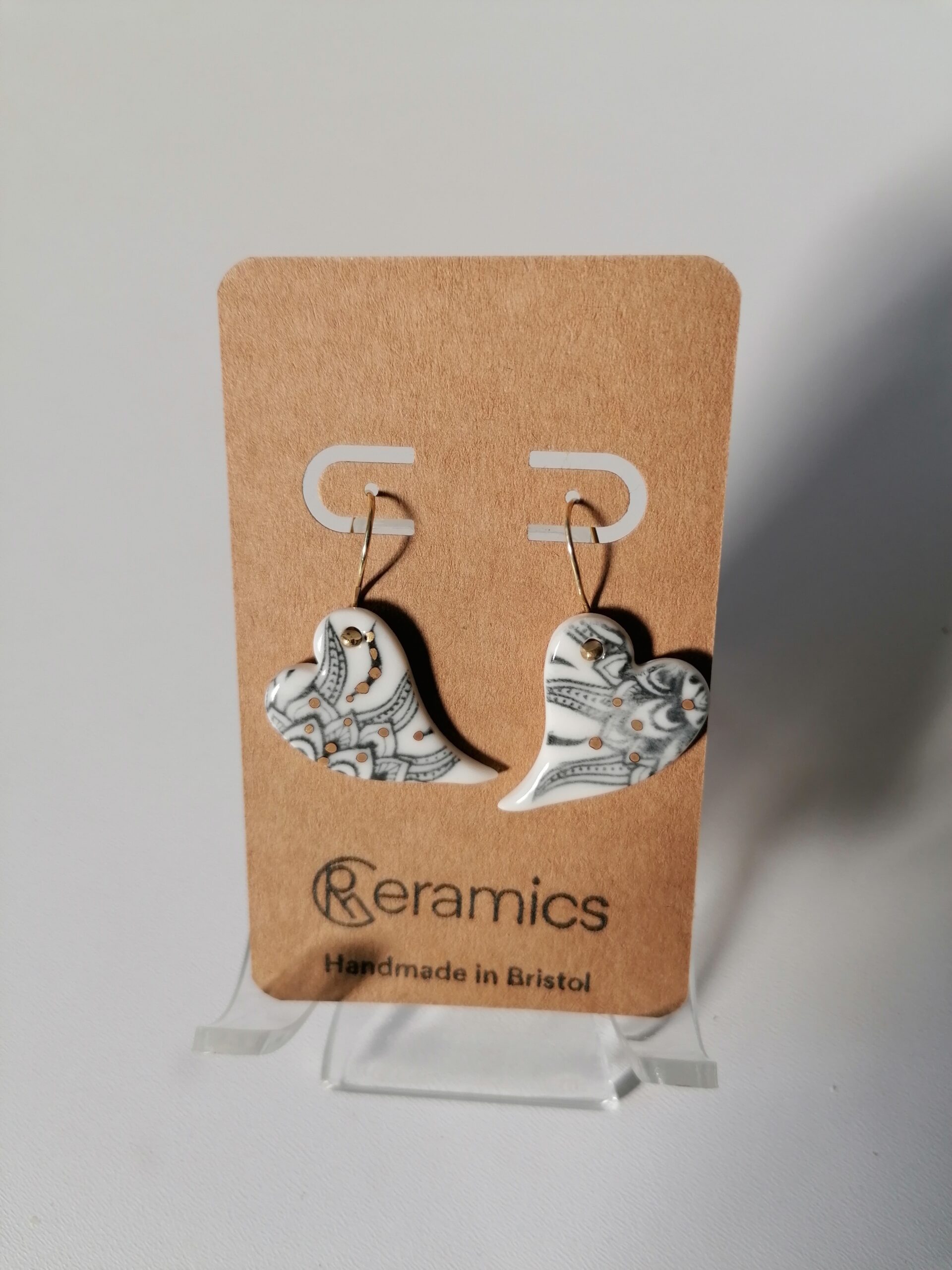 Dangly ceramic earrings with sterling silver and 24 karat gold plated hooks. Handmade by RMC Ceramics
