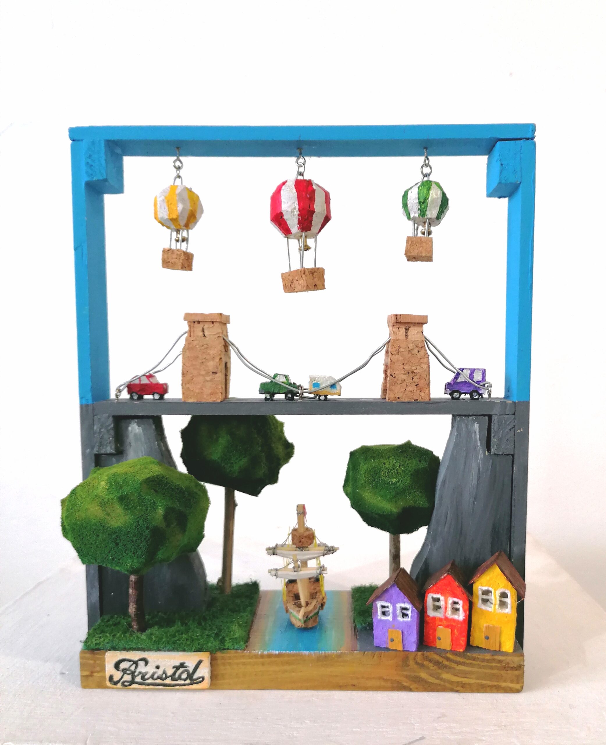 Handmade by Diego Godoy. This unique mini Bristol diorama has The Clifton Suspension Bridge, colourful houses, balloons, and the iconic The Matthew ship under the bridge! Materials used: cork, toothpicks, sponge, skewers, scouring pad, wood, screws and wire etc.
