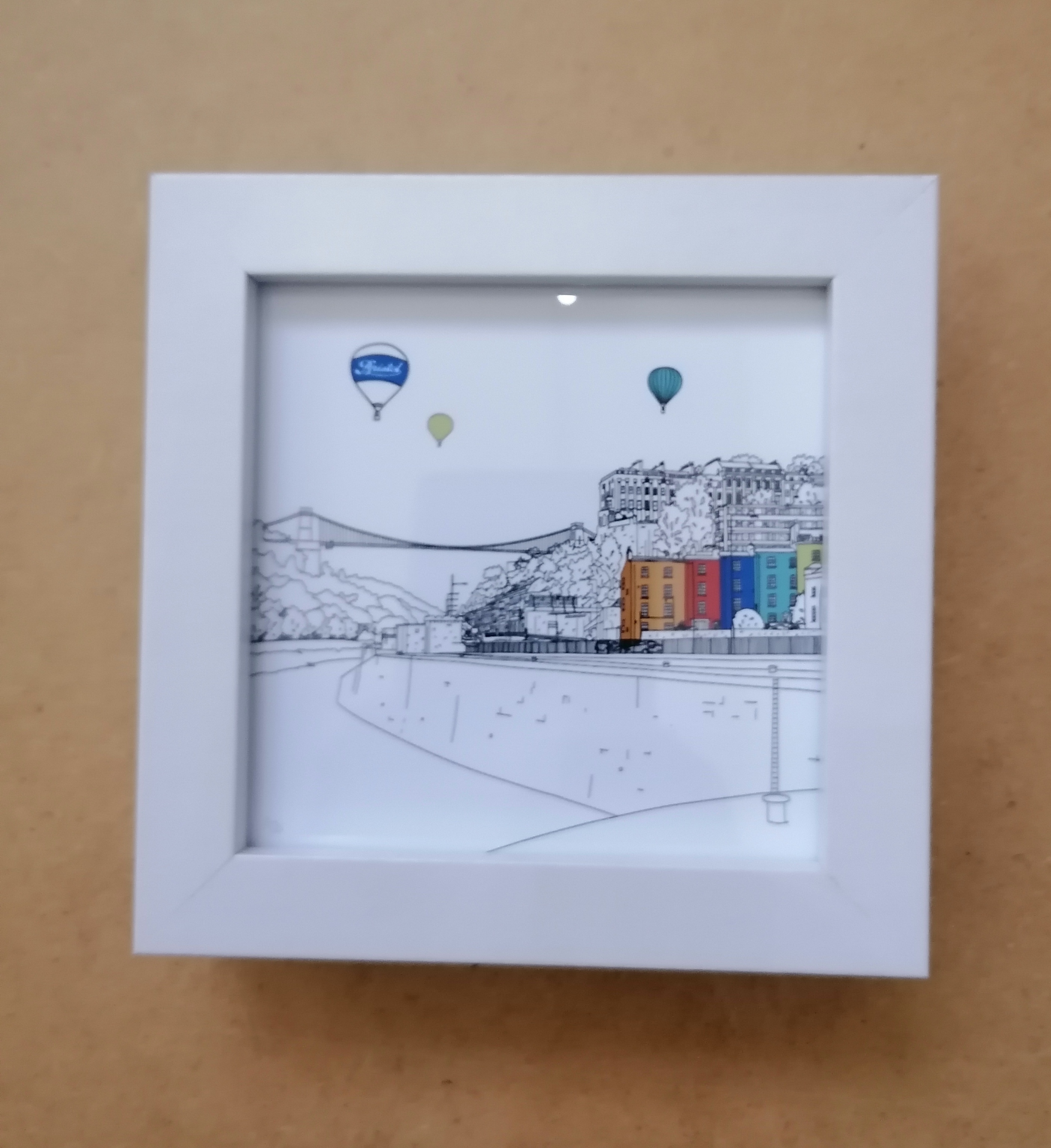 Mini framed Image of the Clifton Suspension Bridge, colourful houses and hot air balloons.