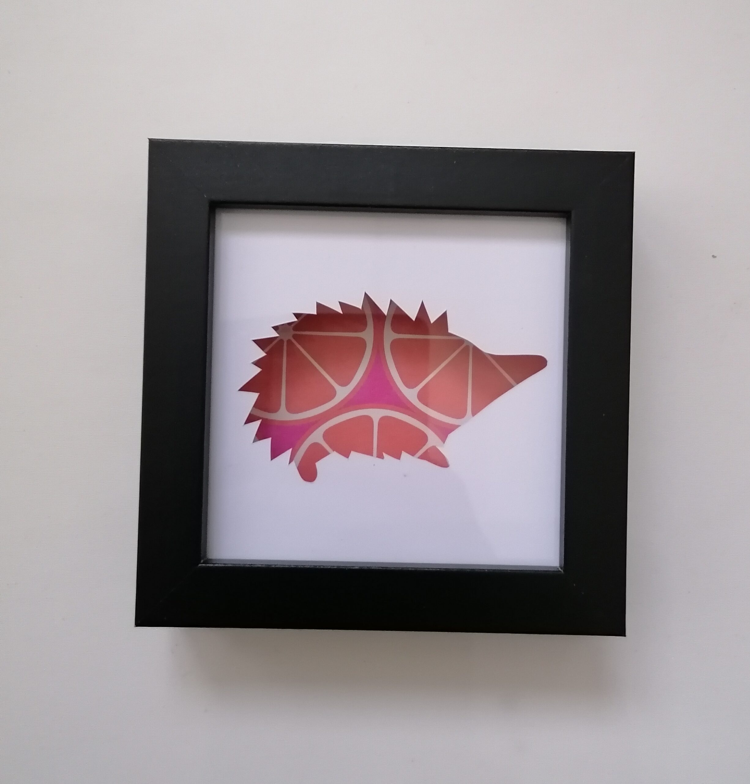 Hand cut and framed paper silhouette of a hedgehog.