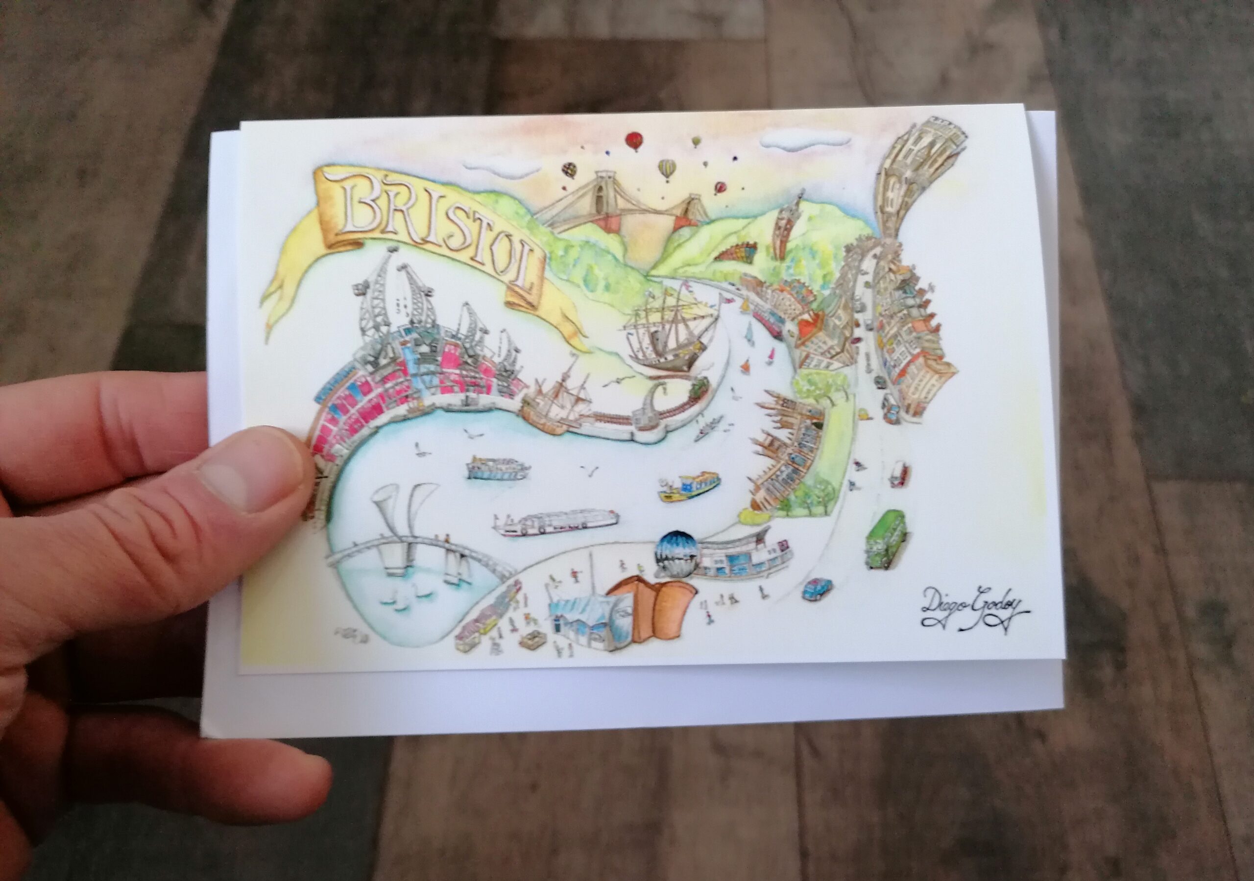 Bristol themed greeting card with colourful design based on an original painting by Bristol based artist Diego Godoy. The card is left blank inside and comes sealed in a clear cello bag.