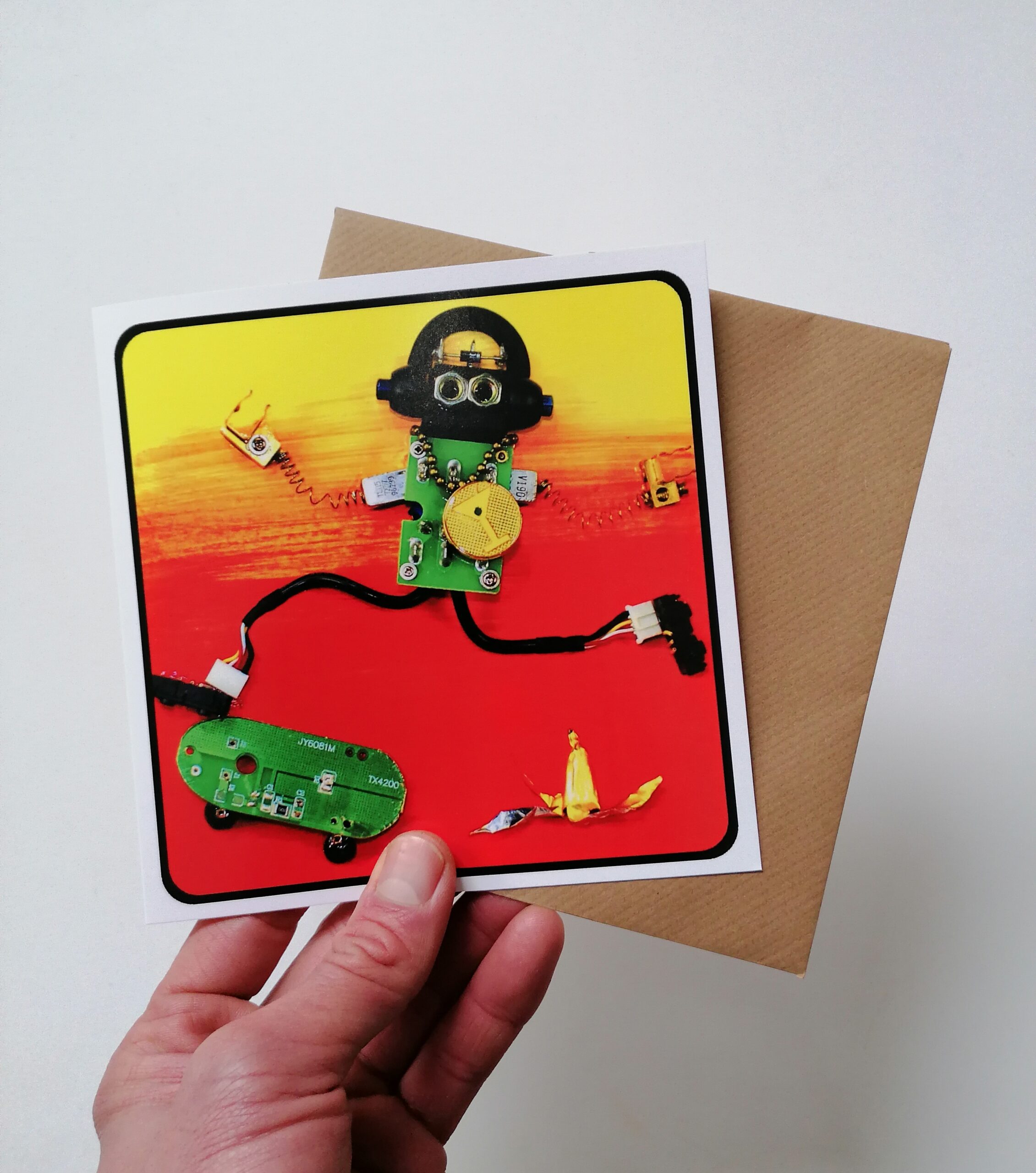 These colourful designs are based on original artwork of Bristol based artist Diego Godoy who uses pieces of refused electronics, street-found bits and bobs and other recycled and upcycled materials to create scenes of robots in funny situations. These cards are full of character and humour and will uplift the mood of the lucky ones who receive one of these quirky cards.