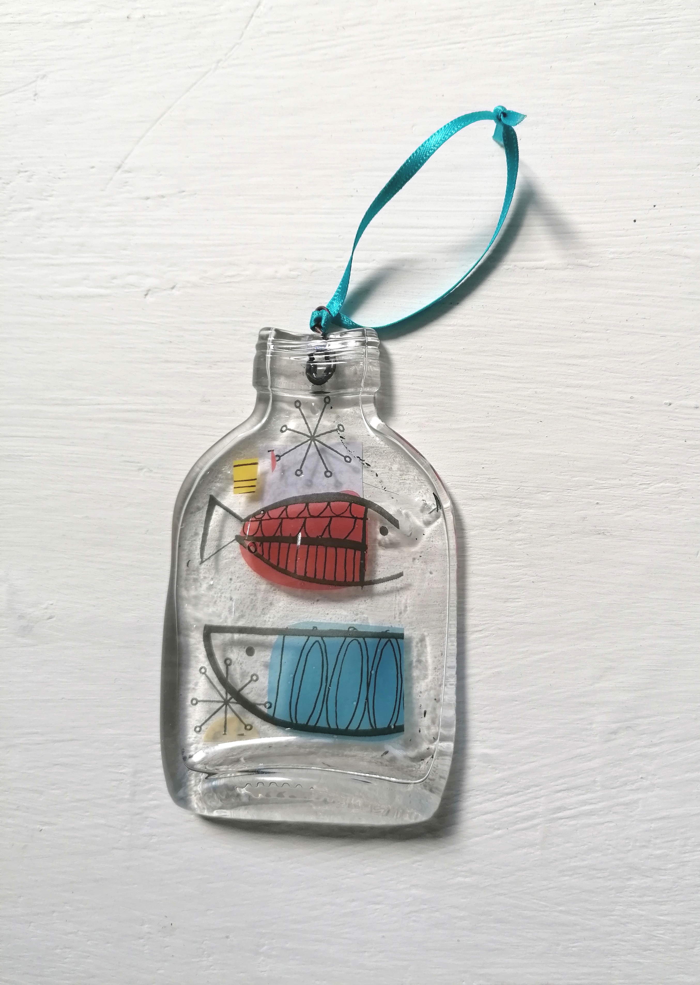 Small Slumped Bottle with Fish Design(Blue and Red)